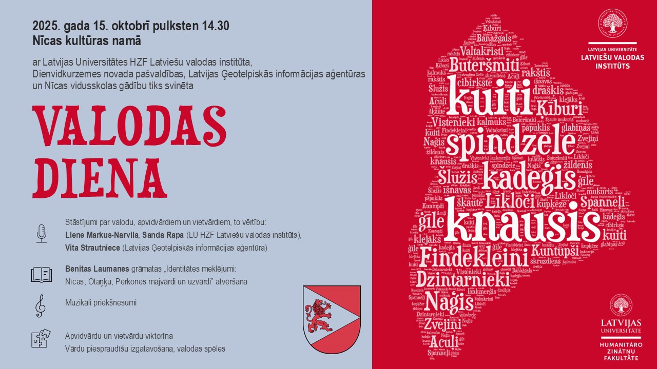 Trešdien, 15. oktobrī, valodnieki pošas uz Dienvidkurzemes novada Nīcas pagastu, lai iepazītu mūsdienu Nīcas valodas bagātības, salīdzinātu tās ar agrāk iegūtajiem dotumiem, lai godinātu nīceniekus un cildinātu Nīcas kultūrtelpu, tāpēc ikviens Nīcas skartais un valodas mīļotājs ir aicināts uz Nīcas kultūras namu, kur ar LU Latviešu valodas institūta, Dienvidkurzemes novada pašvaldības, Latvijas Ģeotelpiskās informācijas aģentūras un Nīcas vidusskolas gādību svinēsim VALODAS DIENU.