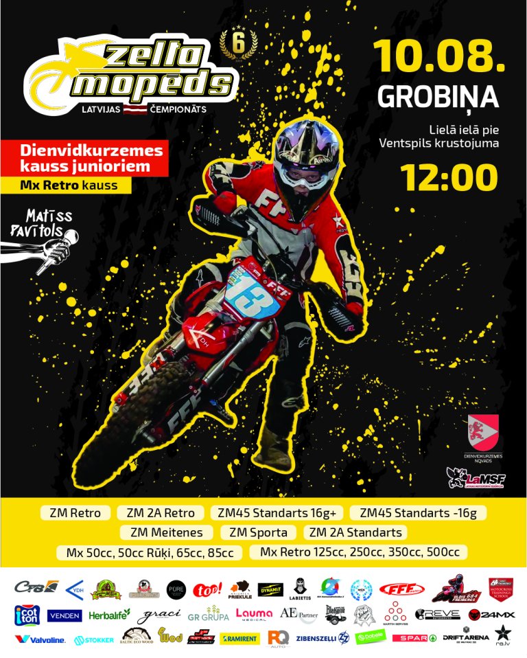 Svētdien, 10. augustā, Grobiņas centrā, Lielā ielā pie Ventspils krustojuma, jau sesto gadu pēc kārtas notiks “Zelta mopēda” Latvijas čempionāta trešais posms, kā arī “MX Retro” kausa sacensības un Dienvidkurzemes kauss junioriem. Starta signāls tiks dots pulksten 12.
