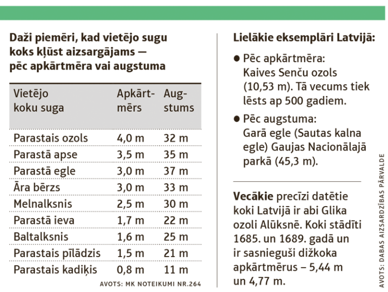 “Ne vienmēr tikai liels, skaists koks ir dižkoks, katrai sugai ir konkrētie apkārtmēri un augstuma parametri. Ministru kabineta (MK) noteikumi Nr.264 ir pamats, lai noteiktu, kurām koku sugām un pēc kādiem parametriem nosaka dižkokus. Šajos noteikumos ir minētas 54 sugas, no kurām 25 ir vietējās un pārējās – citzemju. Parametri ir ļoti dažādi, piemēram, Latvijā lielākais skaits dižkoku patiešām ir ozoli, un tam šobrīd noteiktais apkārtmērs ir no 4 metriem, kas tiek mērīti 1,3 metru augstumā no sakņu kakla. Turpretī lai, piemēram, parastais kadiķis iegūtu dižkoka nosaukumu, tam jāsasniedz tikai 0,8 metru apkārtmērs,” skaidro I.Pučkina.