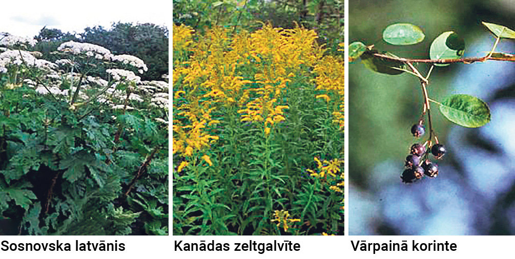 Latvijā biežāk sastopamās invazīvās augu sugas ir Sosnovska latvānis (Heracleum sosnowskyi), kas plaši ieviests Eiropā kā dekoratīvs un lopbarības augs un pārgājis savvaļā, puķu sprigane (Impatiens glandulifera), Kanādas zeltgalvīte (Solidago canadensis), vārpainā korinte (Amelanchier spicata), pīlādžlapu sorbārija (Sorbaria sorbifolia), ošlapu kļava (Acer negundo), krokainā roze (Rosa rugosa) un citas.