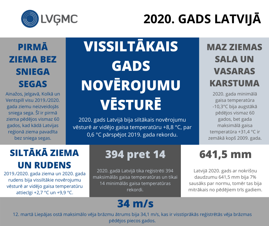 Pasaulē seši siltākie gadi novēroti kopš 2015. gada. Lai gan detalizētāku klimata apskatu par 2020. gadu PMO publicēs martā, jau tagad zināms, ka pasaulē pērnais kopā ar 2016. un 2019. gadu ir starp trīs siltākajiem gadiem meteoroloģisko novērojumu vēsturē. 2020. gada vidējā gaisa temperatūra pasaulē bija 1,2±0,1°C virs 1850.–1990. gadu vidējās vērtības. Savukārt Eiropā 2020. gads bijis ar visaugstāko vidējo gaisa temperatūru. Netipiski, ka pasaules vidējā gaisa temperatūra aizvadītajā gadā ir saglabājusies augsta, neskatoties uz La Ninja parādību, kas parasti saistīta ar zemākām globālajām temperatūrām.