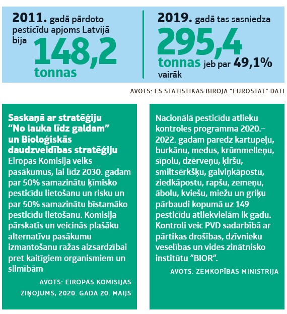EFSA 2019. gada apjomīgā atskaite atklāj, ka vairāk nekā puse produktu vispār nesatur pārsniedzošo daudzumu. “Latvija ir droša valsts, jo pie mums ļoti labi strādā PVD un VAAD. Pesticīdu lietošana tiek stingri kontrolēta. Katru gadu pietiekami daudz izlases kārtībā tiek ņemti paraugi no dažādām saimniecībām. Pēdējos desmit gados situācija ir ļoti uzlabojusies, jo ir mazināta nelegālo pesticīdu lietošana,” stāsta M.Gailīte. Latvijā drīkst izmantot tikai tos augu aizsardzības līdzekļus (AAL), kas ir reģistrēti, un tikai tajos kultūraugos, kuros tie ir reģistrēti, un tikai pret noteiktajiem kaitīgajiem organismiem. “Tas, kurus līdzekļus mēs lietojam, ir atkarīgs gan no laikapstākļiem, gan no tā, kādi kaitēkļi ir aktuāli tieši šogad un kādus preparātus tirgotāji ir ieveduši Latvijā. Šie līdzekļi patiesībā ir ļoti dārgi. Pret slimībām fungicīdiem, piemēram, viens līdzeklis puslitra pudelītē maksā 13 eiro, un to var lietot 12–16 mililitrus uz 100 kvadrātmetriem. Ir arī līdzekļi, kuri maksā virs 80 eiro/ha. Graudaugiem izmanto herbicīdus, kas ir atļauti 17–19 grami uz hektāru. Bet cilvēki baidās, jo to nezina,” skaidro eksperte.