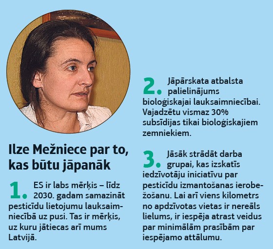 Latvijā pērn tika savākti nedaudz virs 10 000 iedzīvotāju parakstu, lai rosinātu aizliegt pesticīdu lietošanu laukos dzīvojošo personu dzīvesvietu tuvumā (ievērojot viena kilometra attālumu). Iniciatīvas pamatojumā norādīts, ka tā tiks pasargāta laukos dzīvojošo veselība. Vides aizsardzības un reģionālās attīstības ministrijas darba grupai nu jāvērtē šī iniciatīva. Diskusijas pastiprina “Eurostat” publicētie dati par pesticīdu lietošanas pieaugumu Latvijā. Kopš 2011. gada tirgotais pesticīdu apjoms palielinājies vairāk nekā par pusi, ierindojot Latviju otrajā vietā. Lauksaimniecības organizāciju sadarbības padome (LOSP) uzsver – jārunā arī par to, ka Latvijā strauji ir augušas apstrādājamās zemes platības. Valsts augu aizsardzības dienesta (VAAD) un Pārtikas un veterinārā dienesta (PVD) pārstāvji norāda, ka Latvijas iedzīvotāji, lietojot uzturā mūsu valstī ražotos pārtikas produktus, var justies droši, uzmanīgiem vajadzētu būt ar produktiem, kas importēti no trešās pasaules valstīm.