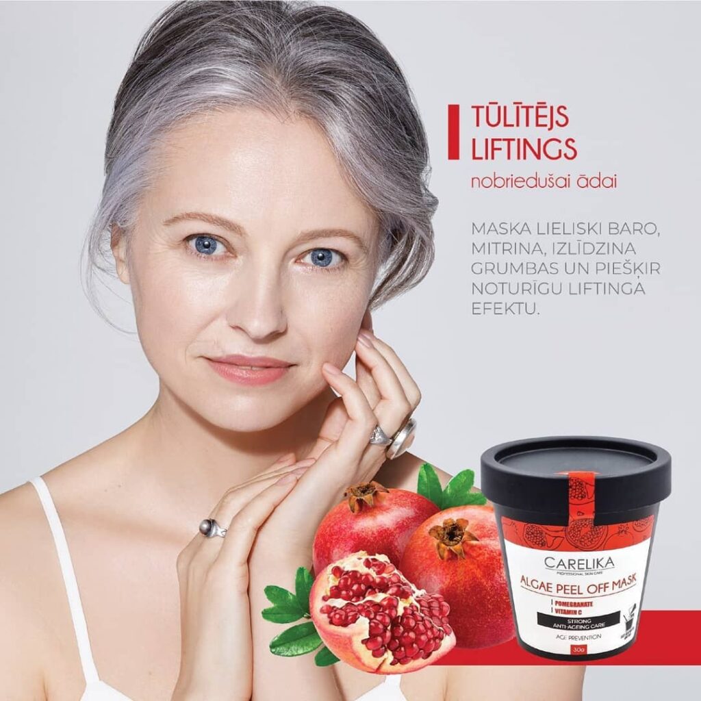 Tūlītēja liftinga maska nobriedušai ādai no CARELIKA bagātina sejas ādu ar efektīvām sastāvdaļām, kas lieliski baro, mitrina un izlīdzina grumbas, piešķirot sejai liftinga efektu. Granātābolu ziedu ekstrakts satur neaizstājamas taukskābes, vitamīnus un antioksidantus. Jūras kolagēns izlīdzina ādas virsmu un atjauno šūnas. C vitamīns lieliski stiprina audus un uzlabo asinsvadu elastību. Lieliska algināta maska, kas veicina ādas savilkšanu, veidojot drenāžas efektu.