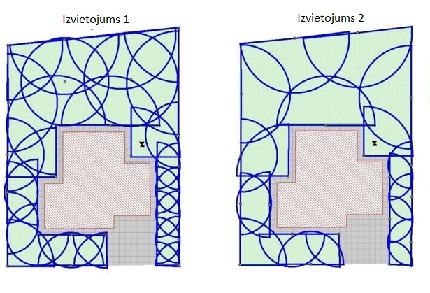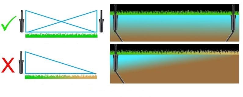 Dažkārt ir apstākļi, kad nav nepieciešams izvietot sprauslas ar 100% pārklāšanos (ziemeļu puse, pastāvīgs ēnojums, ferma, zemes gabala neredzamā daļa), bet visos citos gadījumos iesakām saglabāt vismaz 70% pārklāšanos. Tūlītējs ietaupījums uz smidzinātāju skaitu būs redzams ar neapbruņotu aci, savukārt, iegādājoties aprīkojumu ar nepietiekamu smidzinātāju skaitu, nesajutīsiet reālo laistīšanas sistēmas efektu. Tāpēc vēlams jums nenovērtēt par zemu, cik svarīgi ir pareizi novietoti smidzinātāji. Pareizi modelējot zāliena laistīšanas sistēmu, iegūsiet ne tikai īpaši blīvu un skaistu zālienu, bet arī ietaupīsiet laiku.
