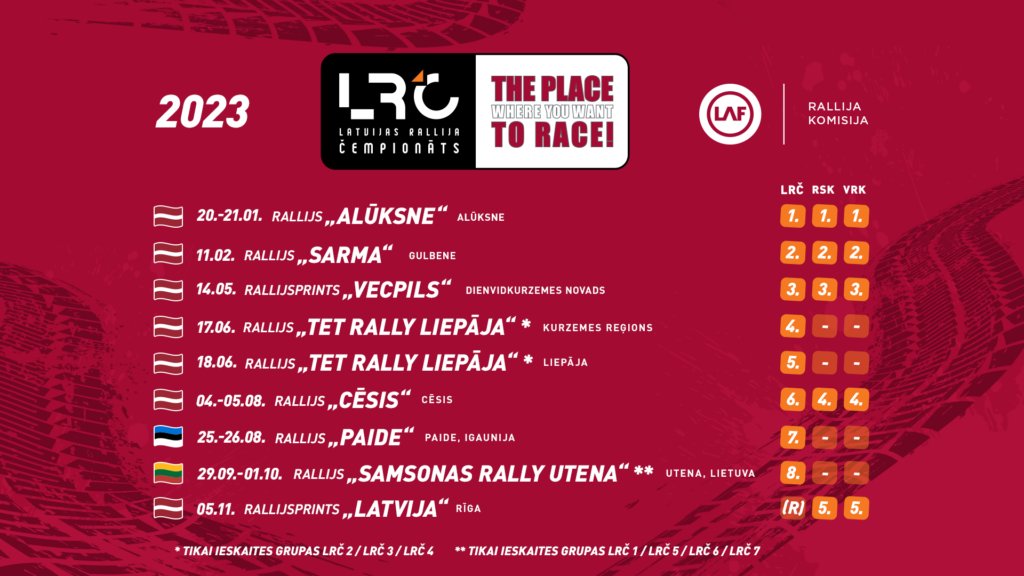 Turpinot uzsākto sadarbību starp Latvijas Automobiļu federāciju un Lietuvas Autosporta federāciju, Latvijas rallija čempionāta 2023. gada sezonas kalendārs papildināts ar Lietuvā plānoto grunts seguma ralliju “Samsonas Rally Utena”.