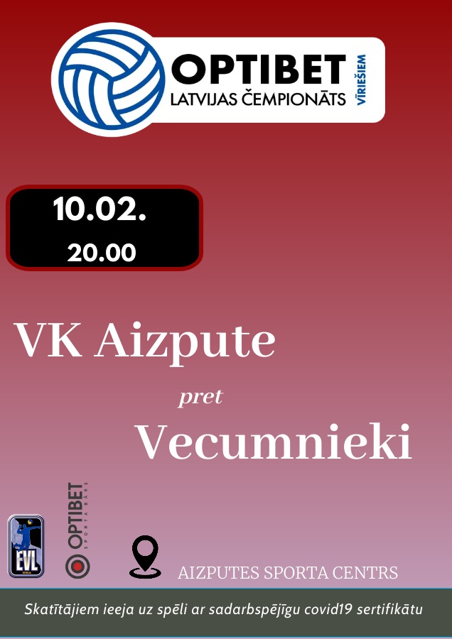 “Aizputes” volejbolisti ceturtdien, 10. februārī, pulksten 20 Aizputes sporta centrā “Optibet” Latvijas volejbola čempionātā spēkosies ar komandu “Vecumnieki”.