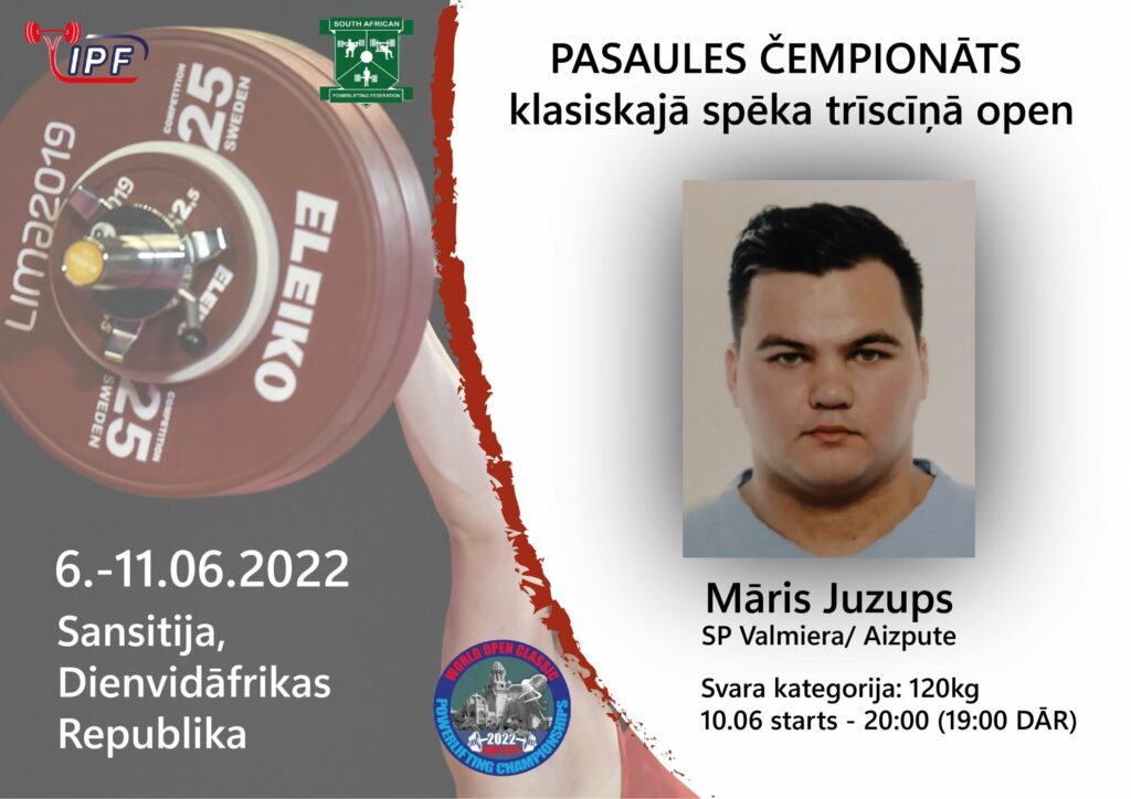 No 6. līdz 11. jūnijam Dienvidāfrikas Republikā Sansitijā norisinās IPF Pasaules čempionāts klasiskajā spēka trīscīņā open grupā, kurā startē arī Aizputes spēkavīrs Māris Juzups.