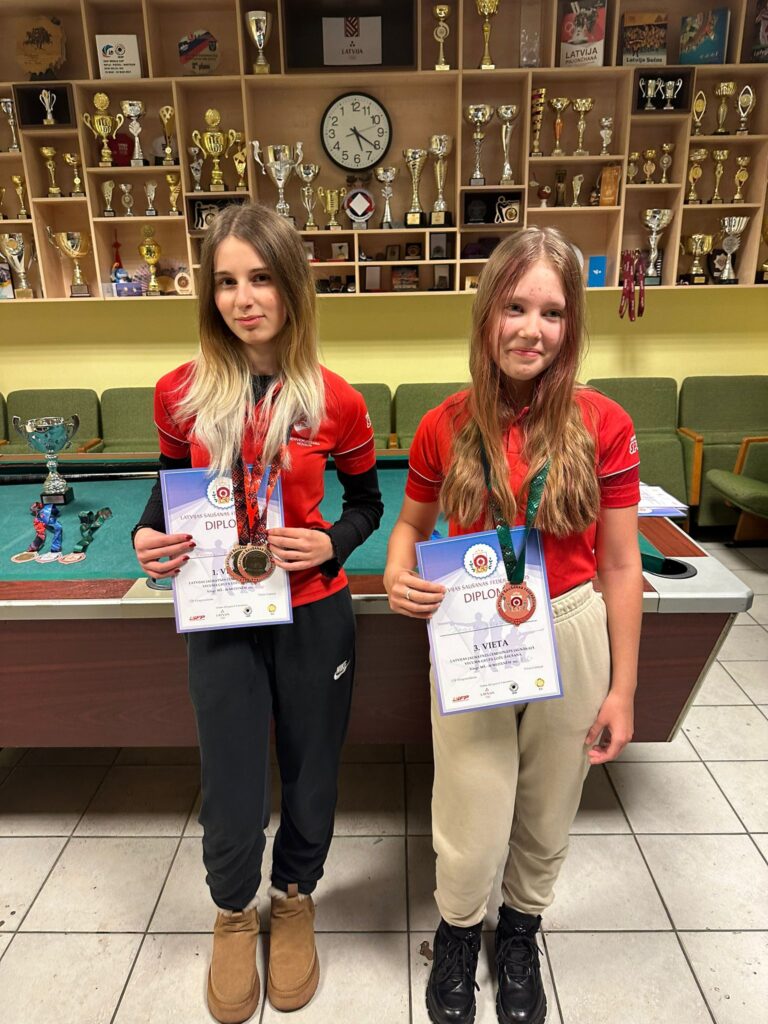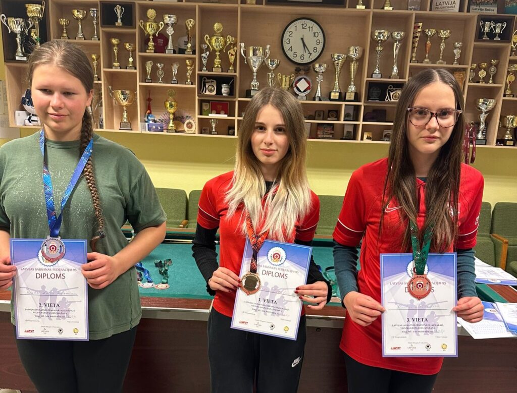 Vingrinājumā “MŠ-3×10” par Latvijas jaunatnes čempioni kļuva Dienvidkurzemes Sporta skolas šāvēja Amanda Zozuļa (vidū), bet bronzas medaļu izcīnīja Marta Lietavniece (pa labi). Foto – Rihards Frīdenbergs.