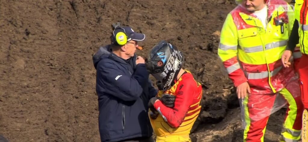 “X.com” kontā “Gate Drop MX” ziņots, ka Jonasam pēc kritiena pirmajā līkumā ir “pleca vai atslēgas kaula savainojums”.