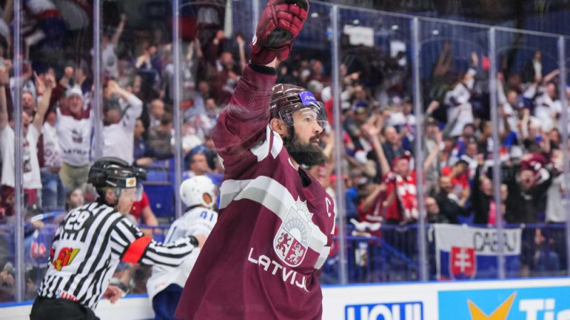 Kaspars Daugaviņš pēc uzvaras vārtu guvuma. Foto: Matt Zambonin/IIHF
