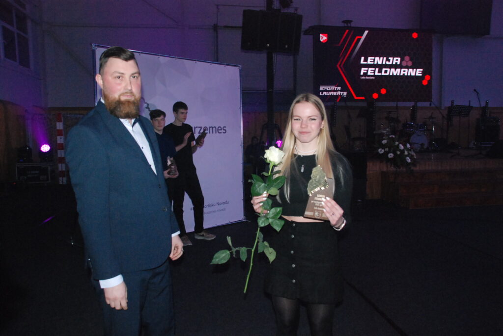 Pagājušā gada laureātā Andris Jankovskis sveic ložu šāvēju Leniju Feldmani.