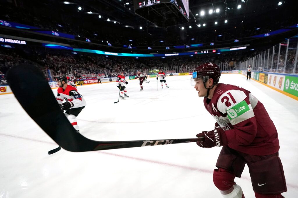 FOTO: Latvijas hokeja izlase pēcspēles metienu sērijā uzvar Austriju; Rūdolfs Balcers gūst divus vārtus