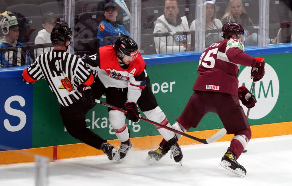 Piektdien pirmo spēli šāda ranga turnīrā aizvadīja uzbrucējs Klāvs Veinbergs, spēlējot ceturtajā maiņā. Viņš gan savā pirmajā nomaiņā pārkāpa noteikumus, taču austrieši vairākumā spēlēja vien 13 sekundes, jo par klupināšanu noraidījās arī Pēters Šnaiders.