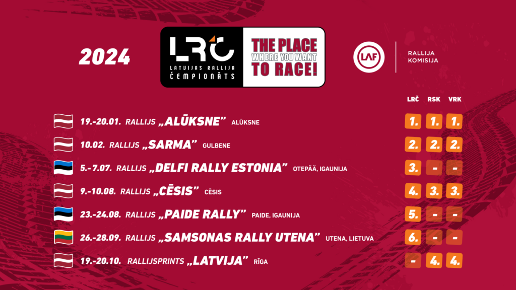Latvijas rallija čempionāta (LRČ) 2024. gada sezonas kalendārā notikušas izmaiņas – ņemot vērā, ka atcelta Igaunijā plānoto sacensību “Võru Rally” norise, Latvijas Automobiļu federācijas Rallija Komisija veica izmaiņas LRČ kalendārā – saglabājot apmaiņas posmu Igaunijā, LRČ sezonas trešo posmu paredzot vienlaicīgi ar “Delfi Rally Estonia”.