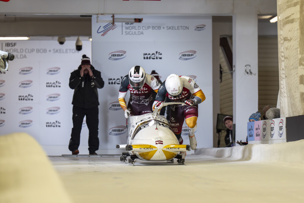 Latvijas ekipāža pirmajā braucienā piekāpās līdera divniekam 0,59 sekundes un atradās piektajā vietā.