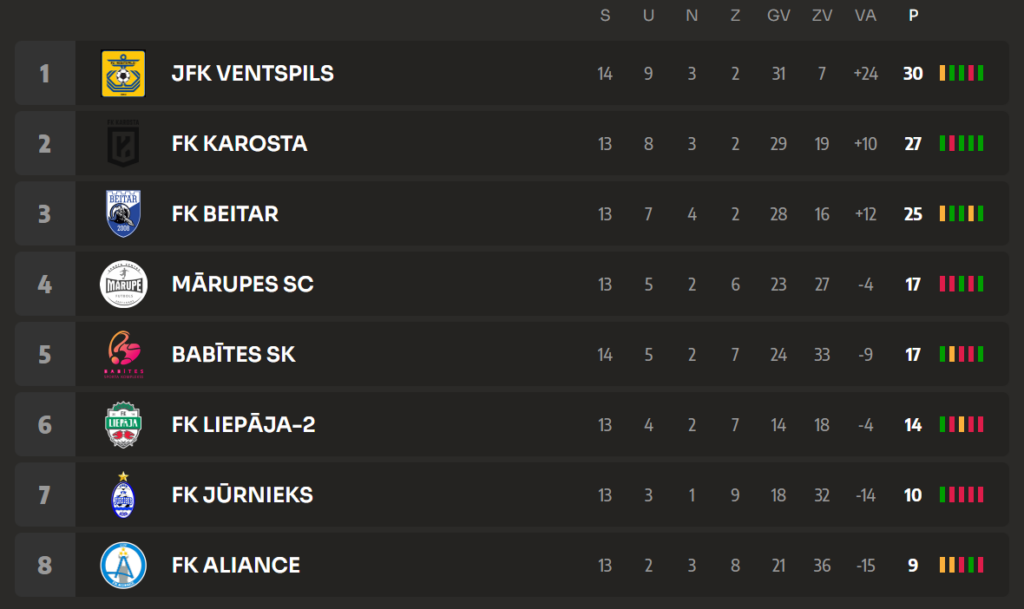 FK “Karosta” šobrīd otrās līgas rietumu zonas turnīra tabulā atrodas 2.vietā ar 27 punktiem un vārtu attiecību 29:19.