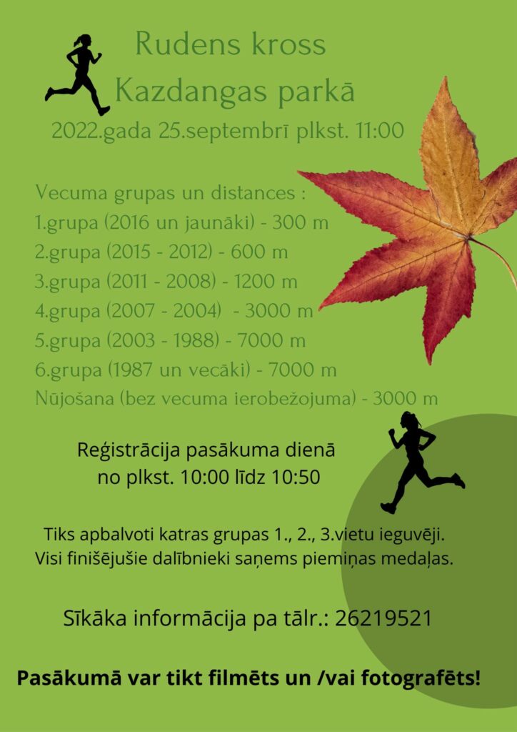 Svētdien, 25. septembrī, pulksten 11 Kazdangas parkā sāksies rudens kross. Skrējēji uzvarētājus noskaidros sešās vecuma grupās. Nūjotāji varēs sacensties 3000 metru distancē bez vecuma ierobežojuma.