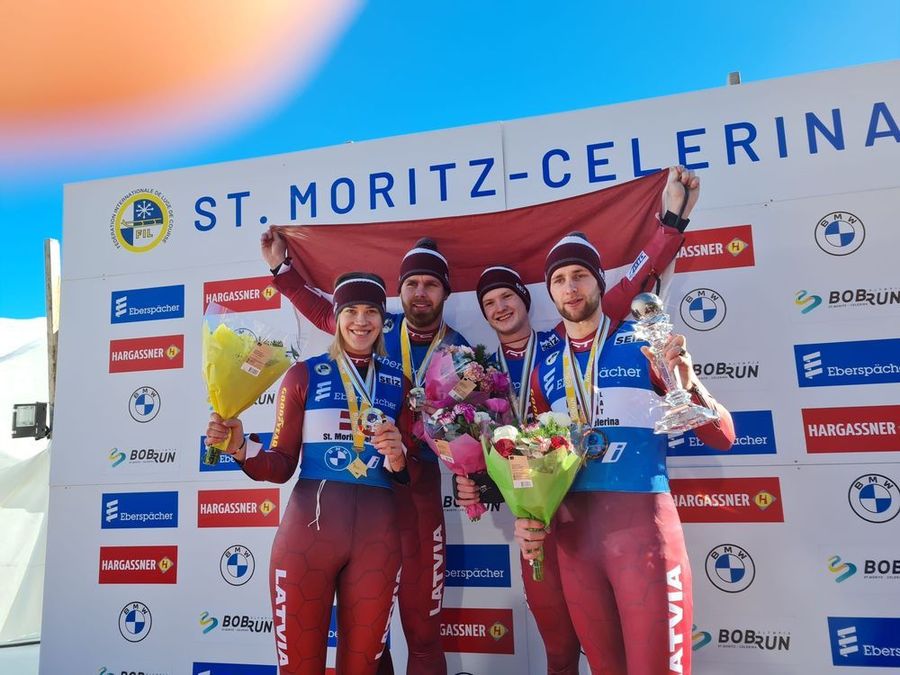 Latvijas kamaniņu braucēji Elīna Ieva Vītola, Kristers Aparjods un Mārtiņš Bots/Roberts Plūme svētdien Sanktmoricas trasē Šveicē izcīnīja zelta medaļu Pasaules kausa sezonas pēdējā posmā, kas vienlaikus bija Eiropas čempionāts.