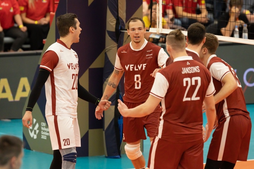 Tomēr Latvijai divus punktus pēc kārtas – uzbrukumā un ar bloku – guva Toms Švans, bet 24:24 panāca Kristaps Platačs uzbrukumā un Švans ar servi.