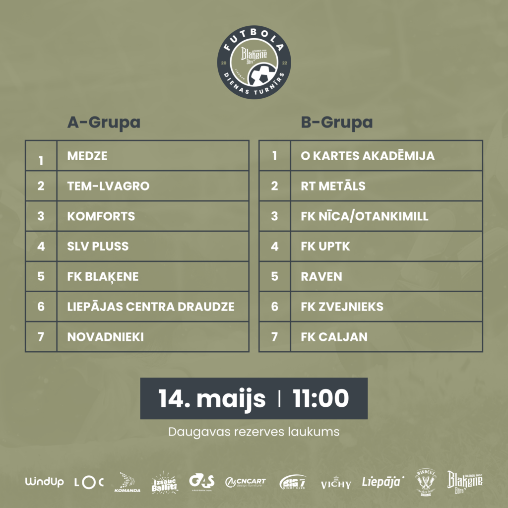 Sestdien, 14. maijā, Liepājas stadiona “Daugavas” rezerves laukumā, norisināsies vienas dienas futbola turnīrs – ““Blaķenes” dienas futbola turnīrs”. Dalībai turnīrā pieteikušās 14 komandas: “Liepājas Centra Draudze”; “Komforts”, “Raven”; “TEM-LVAGRO”; FK “Zvejnieks”; FK “Caljan”; “RT Metāls”; “Novadnieki”; “SLV PLUSS”; FK “UPTK”; FK “Nīca/OtankiMill”; “Okartes Akadēmija”; FK “Blaķene”.