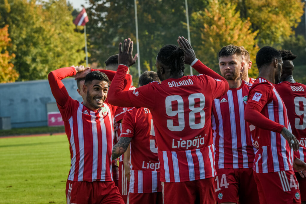 Liepājnieki izvirzījās vadībā mača 32.minūtē, kad pēc Eduarda Tīdenberga piespēles soda laukumā ar galvu bumbu vārtos raidīja Gotjē Mankenda.