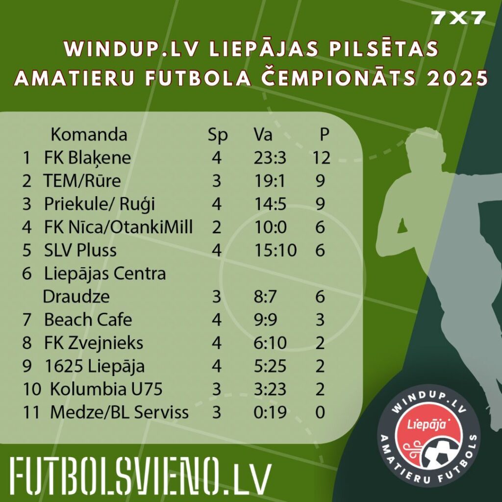 Turnīra tabulas vadībā izrietoši ar četrām uzvarām četros mačos izvirzījies FK “Blaķene”. Otrā pozīcija par spēli mazāk aizvadījušajai “TEM/Rūre” vienībai, savukārt pirms svētkiem līderu statusu baudošā “Priekule/Ruģi” patlaban bronzas ailītē. Savu vārdu teikt var arī “Nīca/OtankiMill”, kuriem līdz šim vien divi dueļi, toties abi uzvarēti.