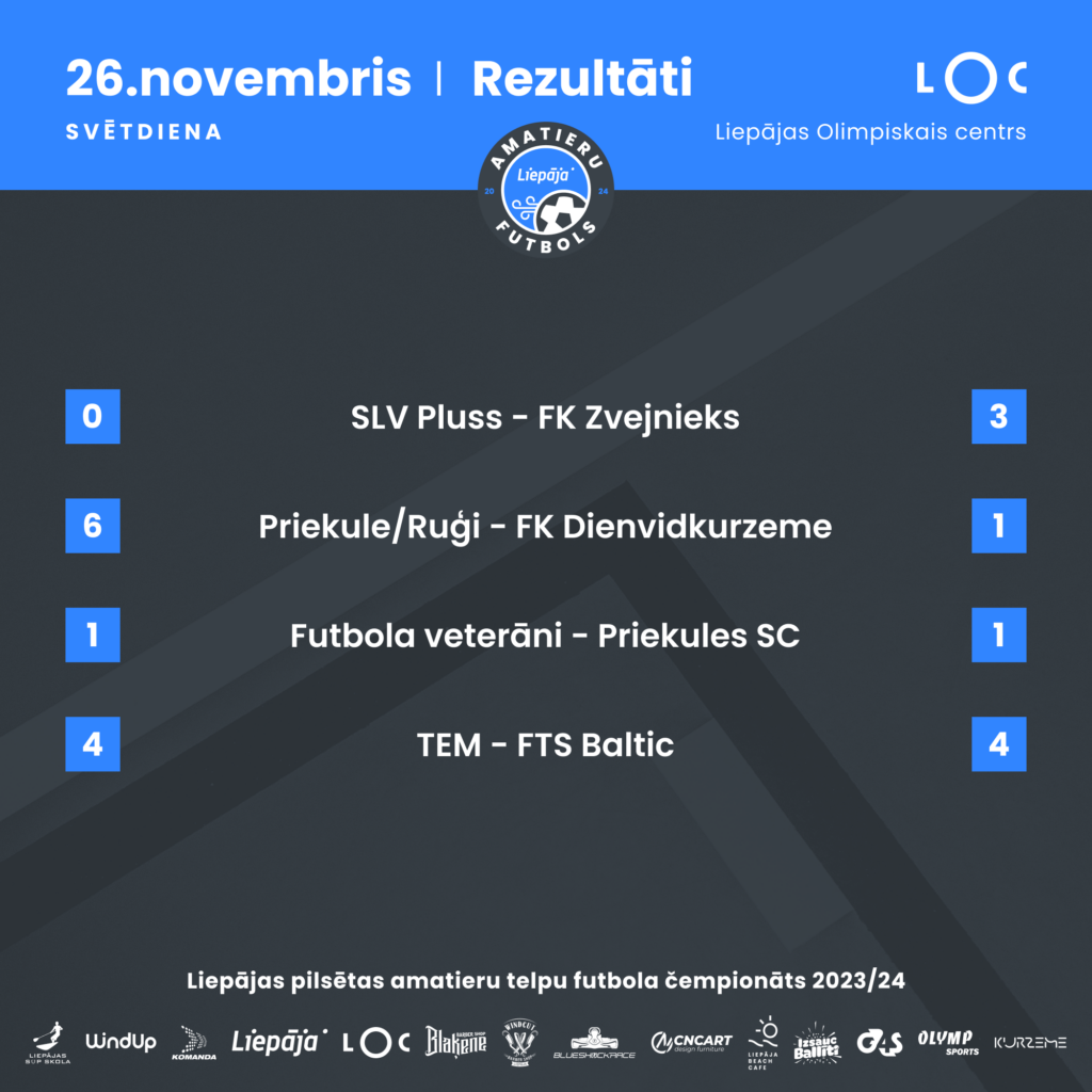 Aizvadītajā svētdienā tika uzsākts Liepājas pilsētas amatieru telpu futbola čempionāts, kas divās līgās pulcē 13 komandas. Liepājas Olimpiskā centra zālē tika aizvadītas četras spēles, kuru laikā tika sadalīti pirmie čempionāta punkti.