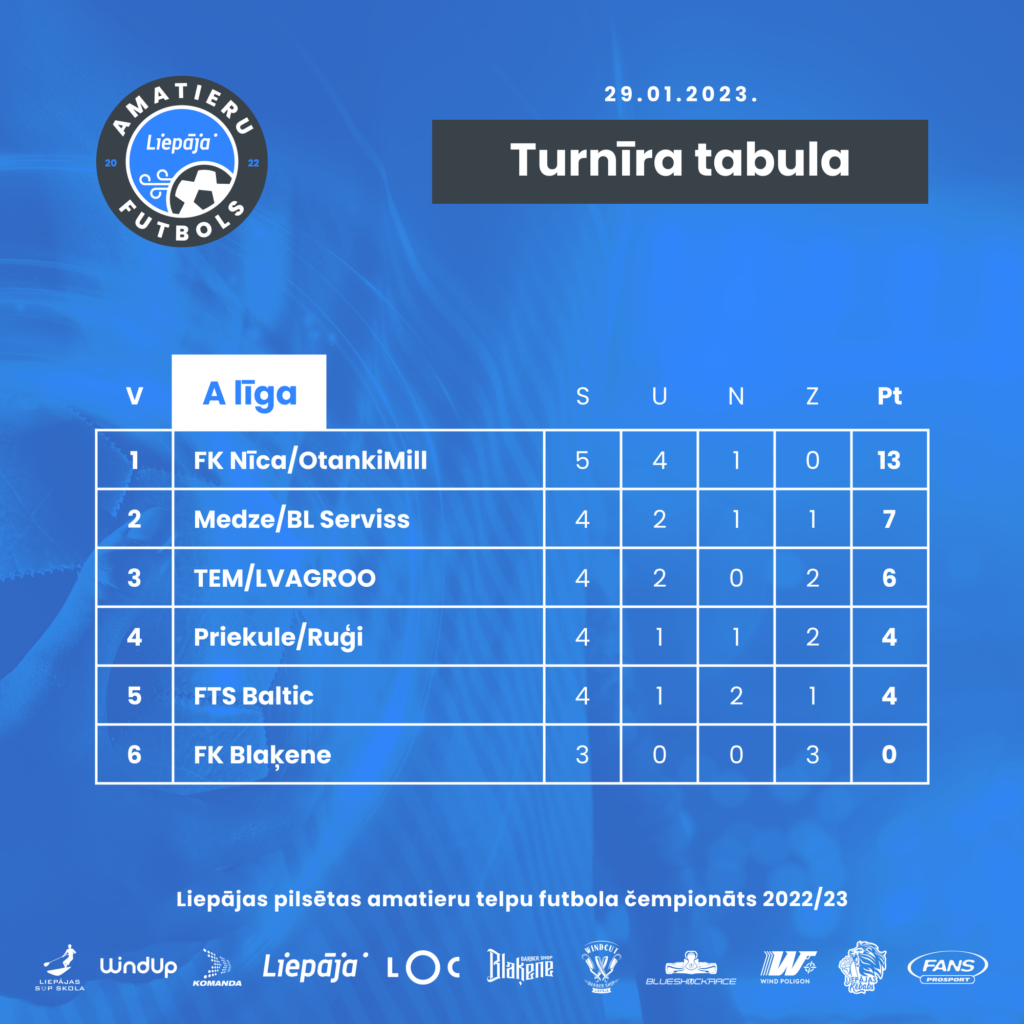 Svētdien, 29.janvārī tika aizvadītas kārtējās Liepājas pilsētas čempionāta telpu futbolā cīņas. Starp četrām spēlēm, kas tika izspēlētas svētdien, divas arī abu līderu savstarpējās tikšanās.
