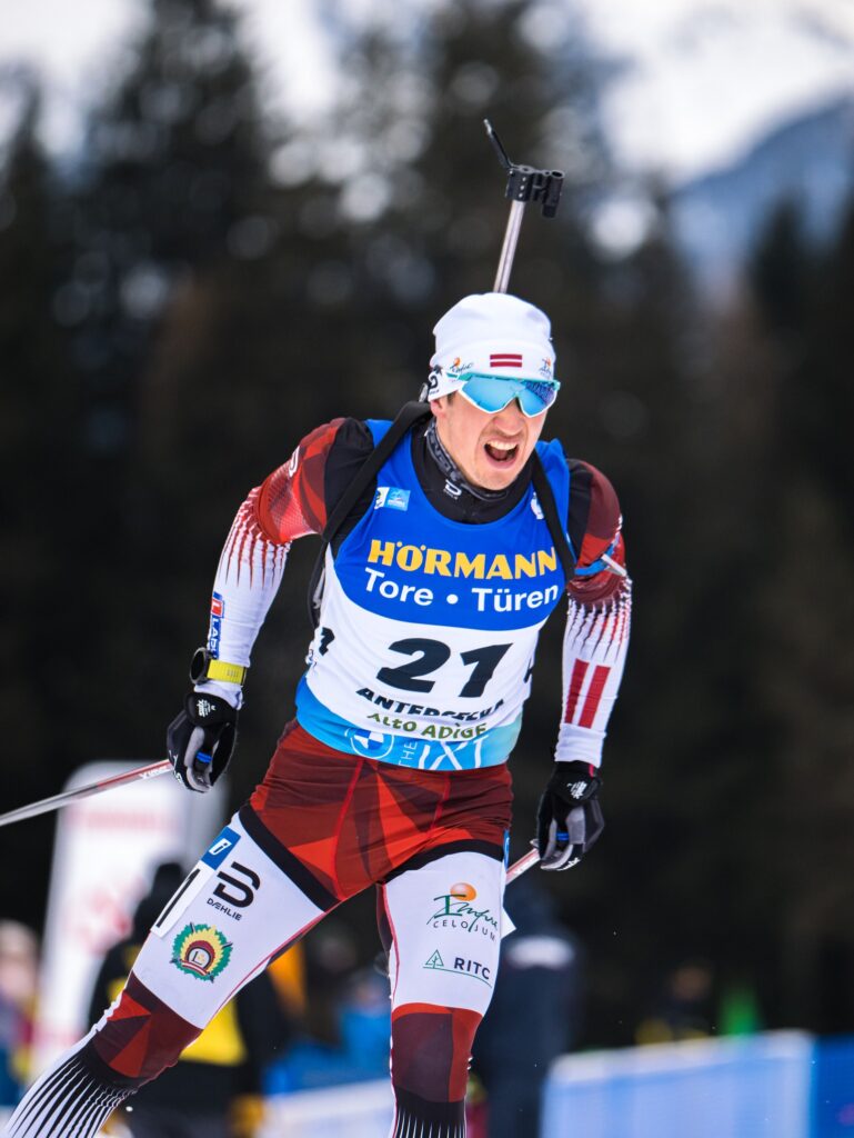 Latvijas biatlonists pirmajā šaušanā tika pie viena soda apļa, bet otrajā ugunslīnijā viņam izdevās aizvērt visus mērķus. Starp otro un trešo šaušanu, atrodoties devītajā vietā, viņš piedzīvoja kritienu, kura dēļ zaudēja apmēram 30 sekundes un noslīdēja par vienu pozīciju zemāk uz desmit vietu.