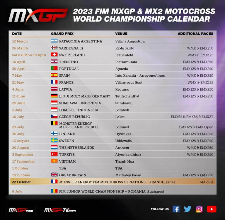 Kopumā šajā MXGP sezonā paredzēti 19 posmi, kas 29 nedēļu garumā tiks aizvadīti 18 dažādās valstīs. Sezonas noslēdzošais posms paredzēts 1. oktobrī ar sacensībām Lielbritānijā.