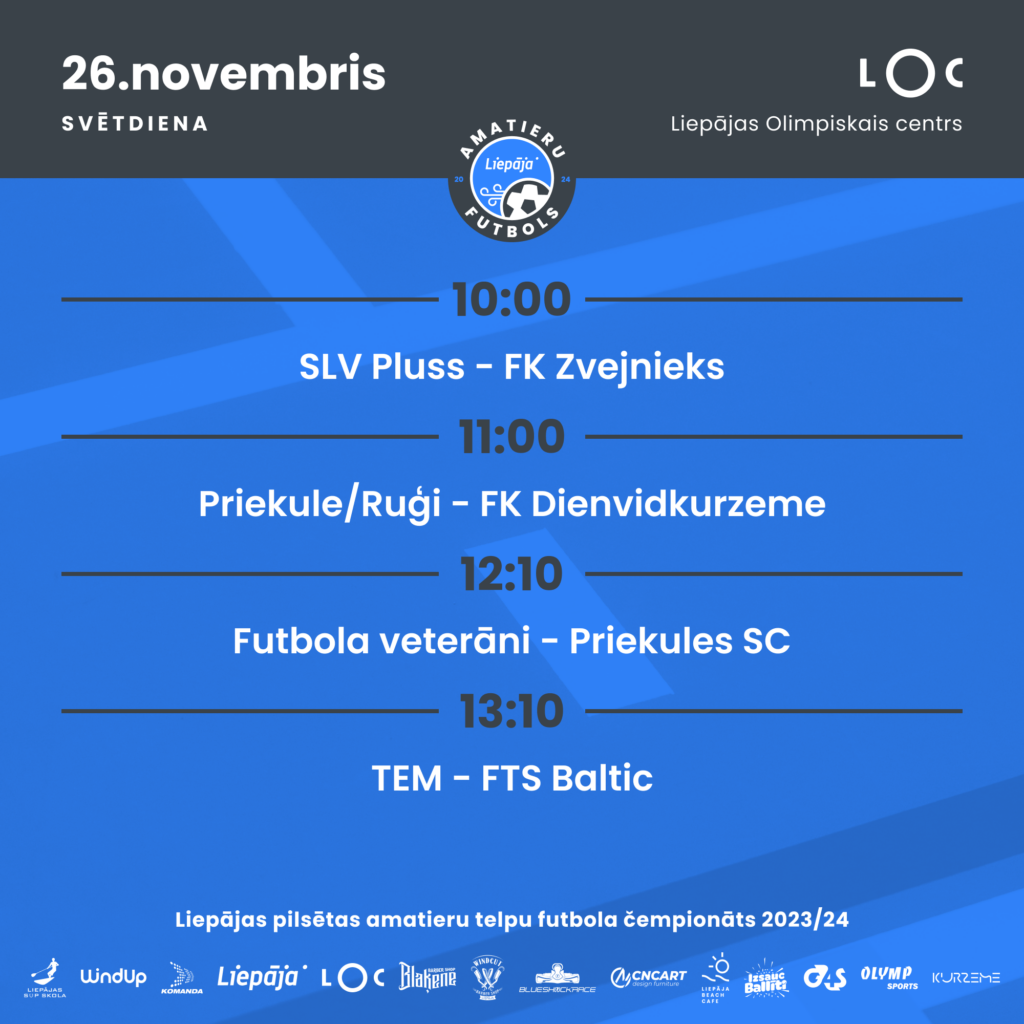 Svētdien, 26. novembrī, Liepājas Olimpiskajā centrā ar pirmajām četrām spēlēs tiks dots starts Liepājas pilsētas amatieru telpu futbola čempionātam.