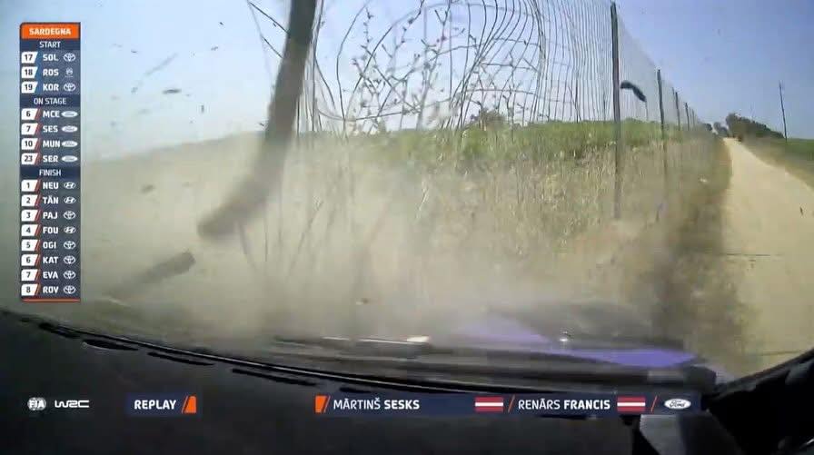 Seska ekipāža, kas šajā WRC sezonā startē ar “M-Sport Ford” komandas sagatavoto “Ford Puma Rally1” auto, otrā ātrumposma trešajā kilometrā pēc neveiksmīgas piezemēšanās pēc neliela lēciena ietriecās žogā, un pļavas malā mašīna arī apgriezās uz jumta. Gan Sesks, Gan Francis pēc tam izkāpa no auto, un sociālajos tīklos Latvijas pilots pavēstīja, ka viņiem abiem viss ir kārtībā, vēsta LETA.