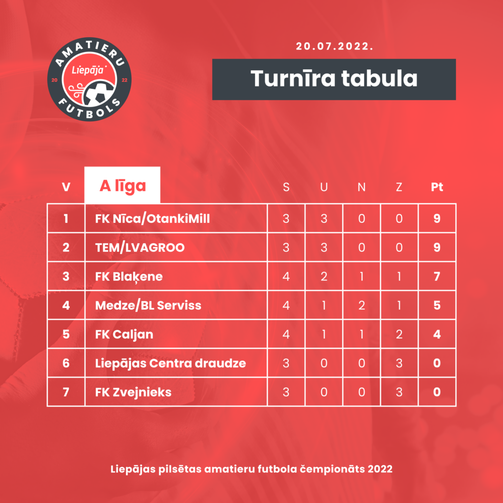 19.jūlija pievakarē tika uzsākta jau sestā kārta pilsētas čempionātā. Ar katru reizi uzlabojot savu sniegumu laukumā, minimālu uzvaru pār “Vaiņodi” izcīnīja “Izsauc ballīti”, savukārt gana rezultatīvi spēlējošā “A.B.A.kompānija” ar 4 – 0 pārspēja “Jūrnieka ligzdu”. “TEM/LVAGROO” A līgas spēlē izcīnīja uzvaru pār “FK Zvejnieks”, bet sīva cīņa norisinājās uz pirmā laukuma, kur tikās “FK Blaķene” un “FK Nīca/OtankiMill”, saspringtā spēlē, tomēr uzvaru ar 3 – 1 guva nīcenieki.