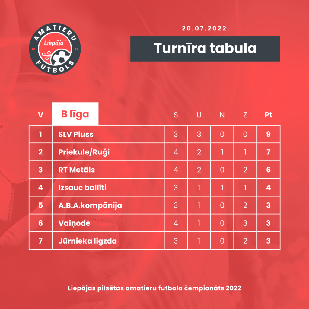 Pirmās laukumā dodas B līgas komandas, kur 12.jūlijā tikās “RT Metāls” un “Jūrnieka ligzda”, “Izsauc ballīti” un “Priekule/Ruģi”. “RT Metāls” guva pārliecinošu uzvaru ar 3 – 1, savukārt cīņā starp “Izsauc ballīti” un “Priekule/Ruģi” tika fiksēts rezultatīvs neizšķirts (3 – 3), kā rezultātā abas komandas izcīnīja pa punktam. Kā nākamās laukumā nāca “Medze/BL Serviss” un “TEM/LVAGROO”, kā arī “FK Nīca/OtankiMill” un “FK Caljan”. Abas spēles bija ļoti rezultatīvas un pie trim punktiem tika “TEM/LV AGROO” (uzvara ar 5 – 2) un “FK Nīca/OtankiMill” (3 – 0)