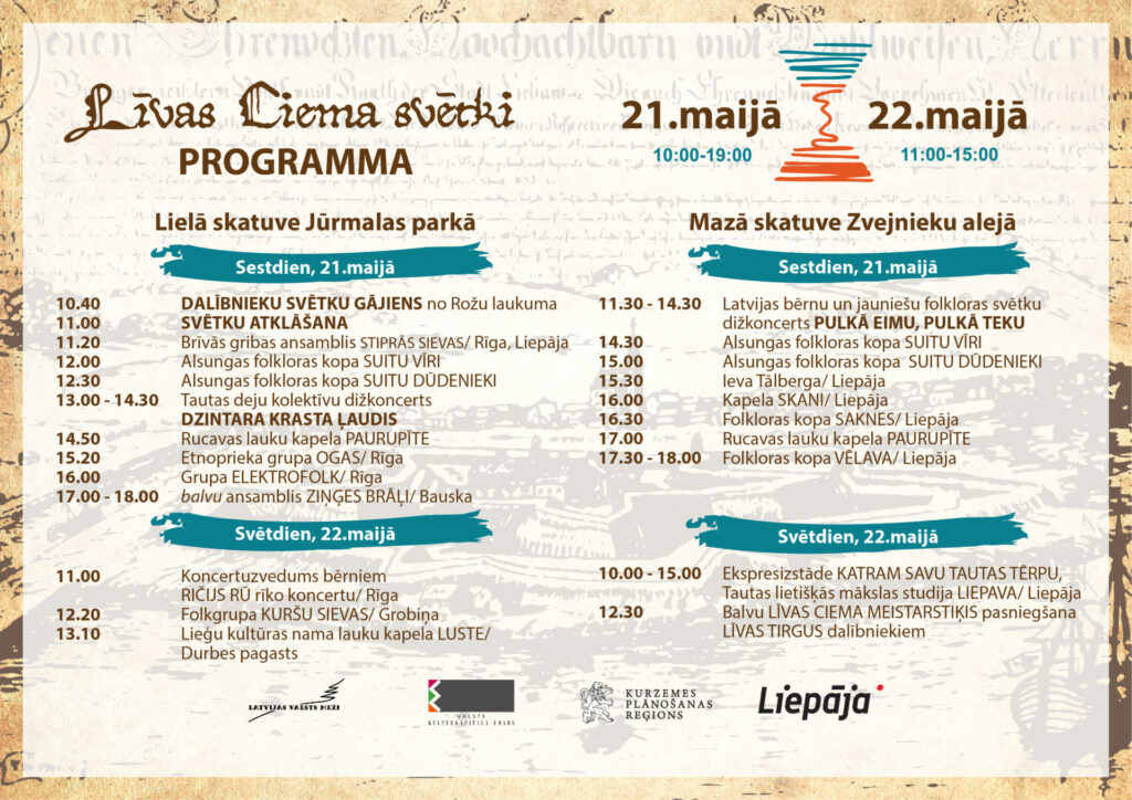 “Līvas ciema svētku” vārti apmeklētājiem būs atvērti sestdien, 21.maijā, no pulksten 10:00 līdz 19:00 un svētdien, 22.maijā, no pulksten 11:00 līdz 15:00.