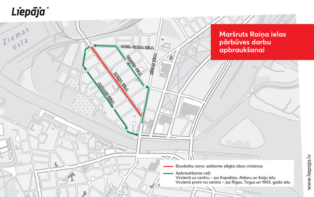 Transporta apbraukšanas ceļš virzienā uz centru tiks virzīts pa Kapsētas, Aldaru un Kaiju ielu. Savukārt virzienā prom no centra – pa Rīgas, Tirgus un 1905. gada ielu.