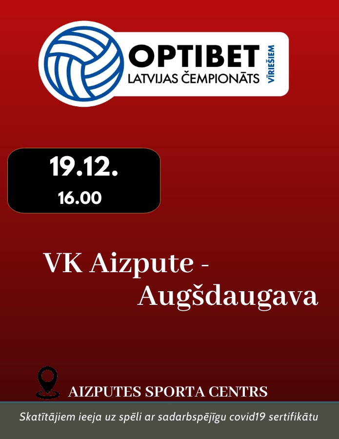 “Aizputes” volejbolisti svētdien, 19. decembrī, pulksten 16 Aizputes sporta centrā “Optibet” Latvijas volejbola čempionātā šā gada pēdējā mājas spēlē uzņems “Augšdaugavas” vienību.